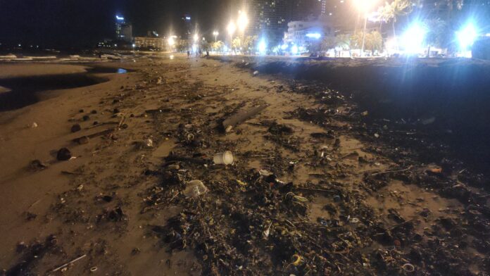 Centrala Pattaya Beach var fylld med ett långt spår av sopor som hade spolats iland på grund av kraftiga vindar och vågor som drabbade staden igår.