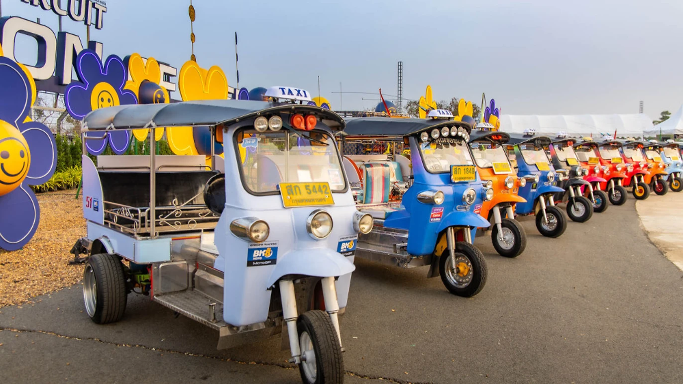 Det är långt ifrån det vanliga upplägget där förare kör runt i bilar och vinkar till fans. Chang International Circuit vill bli större den här gången, och ärligt talat är hela konceptet kaotiskt på bästa sätt. Dessa världsklassförare brukar attackera den här banan i 300 km/h på sina motorcyklar. Nu brottas de med egenheterna hos Thailands legendariska trehjuling.