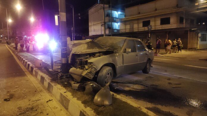 En thailändsk kvinna ska ha tävlat med sin sedan mot en belgisk förare på en Pattaya-väg och kraschat in i en elstolpe och hävdade att hon blev förvirrad efter att den utländska föraren förlöjligade hennes bil.