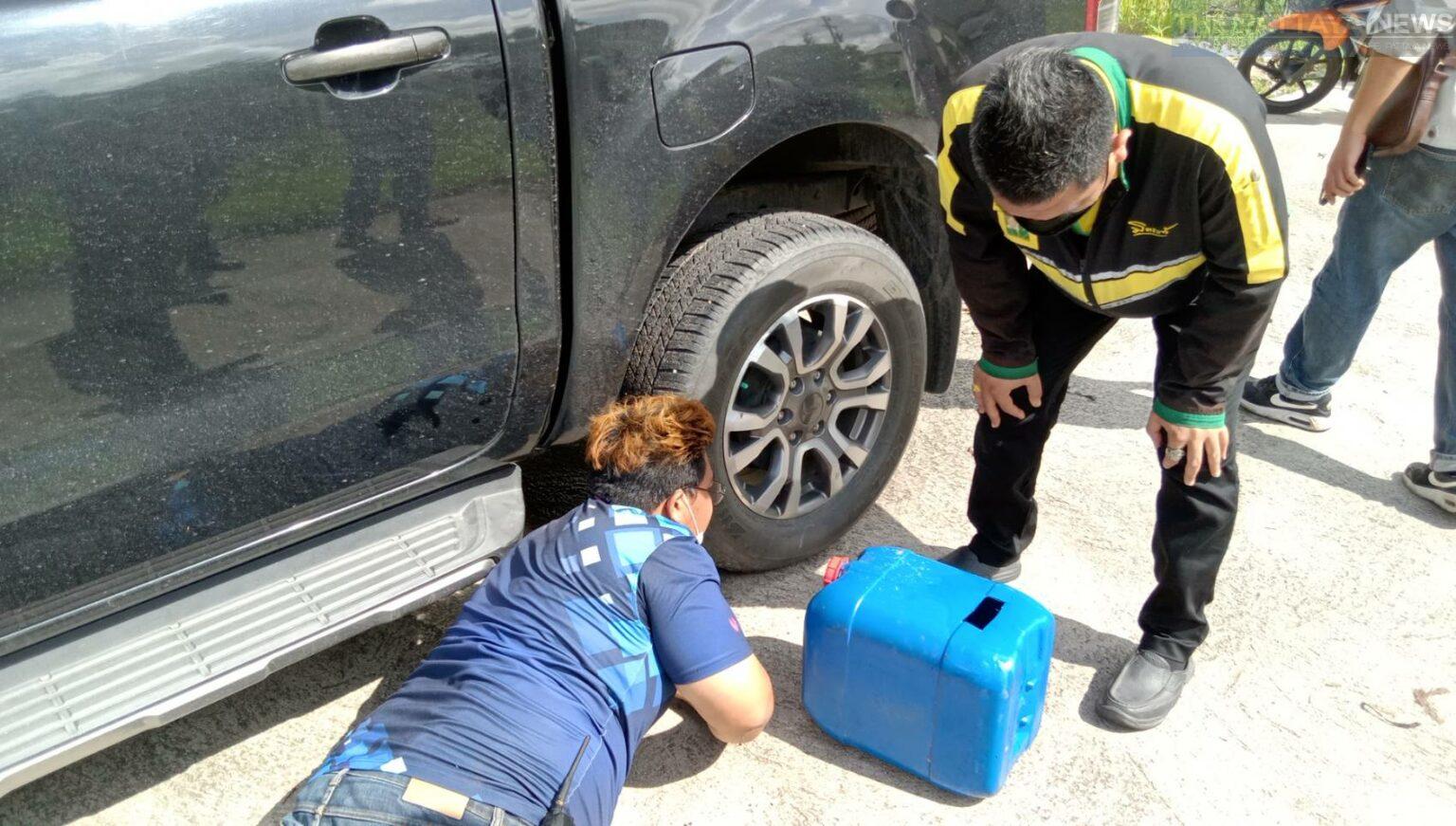 Offret, Chaipichit, 46, väntade på polisen bredvid sin svarta Ford Ranger pickup, som hade en blå plastdunk under sig och som luktade bränsle. Offret sa att en tjuv hade borrat tre hål i pick-upens bensintank för att tömma den på bränslet och sedan använt den blå plastdunken för att samla upp bränslet och flydde.