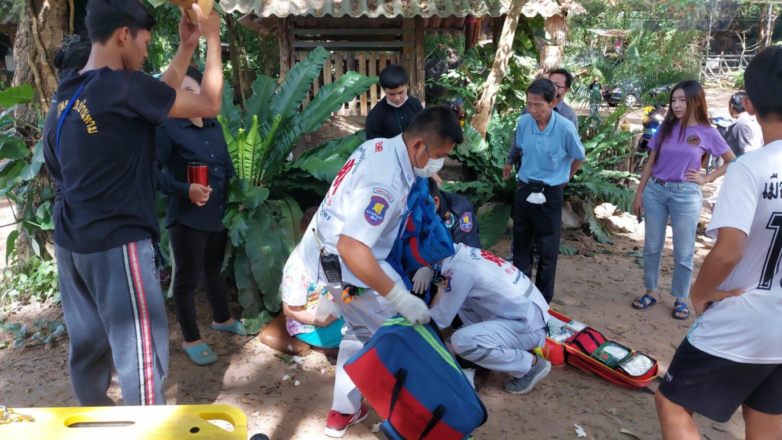 Räddningstjänsten underrättades om händelsen vid 14.30-tiden i en elefantby i Pattaya. De anlände till platsen för att hitta Alice C, 71, och Virginia S, 85, båda amerikaner. De hittades på marken. Närliggande räddningsarbetare hittade mahouten (elefanttränaren) Chamlueang, 73. Alla tre hade fått icke-livshotande skador. Personalen vid elefantbyn berättade att de två turisterna befann sig på en 70-årig elefant som heter ”Somjit” med mahouten. De hade precis avslutat en naturridtur innan de skulle gå ner från elefanten vid turiststationen för naturturer.