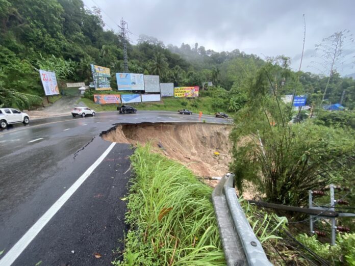 Bilister som är på väg från Kathu till Patong Hill rapporterade skadan kl 15.30 i eftermiddag (19 oktober). På ena sidan av vägen började marken glida vilket har dragit ner vägytan och skyddsräcket. Patongs trafikpolis rapporterar att vägen tillfälligt stängs av nära en kurva vid en vattenpumpstation i Kathu till Suwan Khiri Wong-templet i Patong.